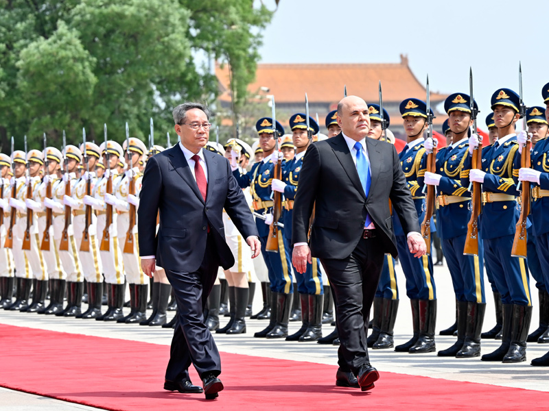 5月24日上午,国务院总理李强在北京人民大会堂同来华进行正式访问的俄罗斯总理米舒斯京举行会谈。这是会谈前,李强在人民大会堂东门外广场为米舒斯京举行欢迎仪式。新华社记者 殷博古 摄