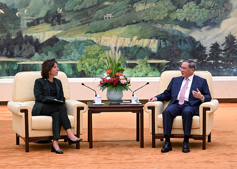 8月29日下午,国务院总理李强在北京人民大会堂会见美国商务部长雷蒙多。新华社记者 饶爱民 摄