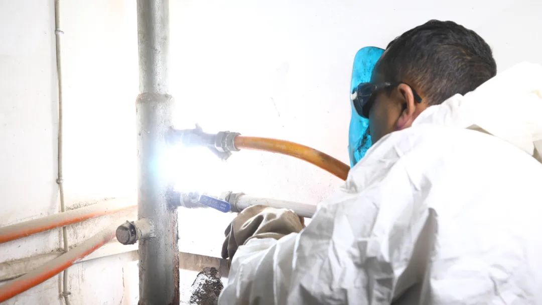 11月13日,在阿克陶县人民路社区老政府家属院3号楼二单元楼道,由于老旧暖气管道破裂,水流外漏浸湿了墙体,阿克陶县暖气管道维修队正争分夺秒地抢修管道,只见电焊师傅戴好防护面具,娴熟地运用着手中的电焊工具,火花四射间,管道破裂处就密封完好了。