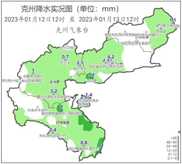 附图:1 月 12 日 12 时~13 日 12 时克州三县一市及部分站点的降雪实