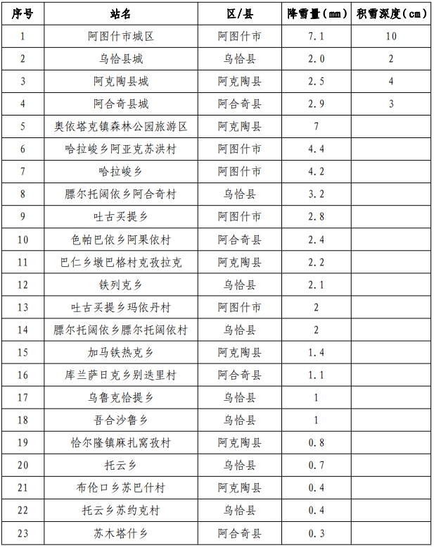 一、天气实况 受冷空气影响,1月12日12时至13日12时,我州大部出现降雪天气。各地普遍出现小到中雪,其中阿图什市城区及周边乡镇、阿克陶县奥依塔克镇一带出现大雪,降雪最大中心出现在阿图什市城区,降雪量为7.1毫米,截至目前阿图什市城区积雪深度达10厘米,降雪仍在持续。三县一市及区域站具体降雪情况见附表。 二、未来天气预测预计今天白天到14日夜间,各地多云有小雪,阿图什市城区周边及北部山区,乌恰县东北部、南部,阿克陶县城周边及南部山有中到大雪,局部有暴雪,偏东风 4~5 级;15日,各地多云转晴,山区局部有零星阵雪,阵风4级。附表:1 月 12 日 12 时~13 日 12 时克州三县一市及部分站点的降雪实况