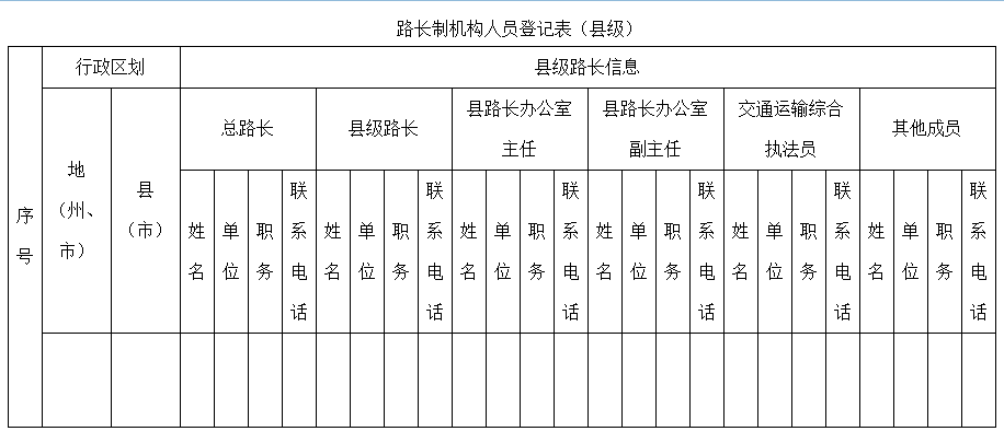 1.县级。设立农村公路总路长,总路长由县人民政府主要负责同志担任;设置县级路长,由县人民政府分管交通运输工作的领导同志担任;县级路长办公室设在交通运输局,办公室主任由交通运输主管部门主要负责人担任。