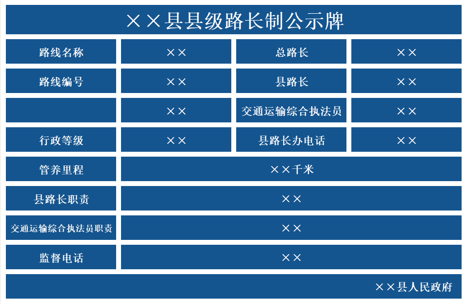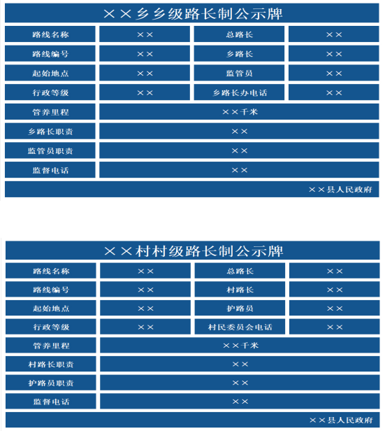 县级路长制办公室按照要求对路长制机构人员、责任路线进行登记造册(详见附件3),将“路长制”有关信息纳入农村公路管理养护公示范围,通过设置公示牌等多种方式向社会公告县、乡镇(管理服务中心)、村各级路长名单,标明人员信息、路长职责、管护路段、监督电话等内容,广泛接受社会监督,督促各级路长履职尽责。(公示牌制作详见附件4)。