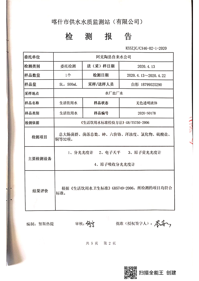 阿克陶县4月份饮用水安全检测报告