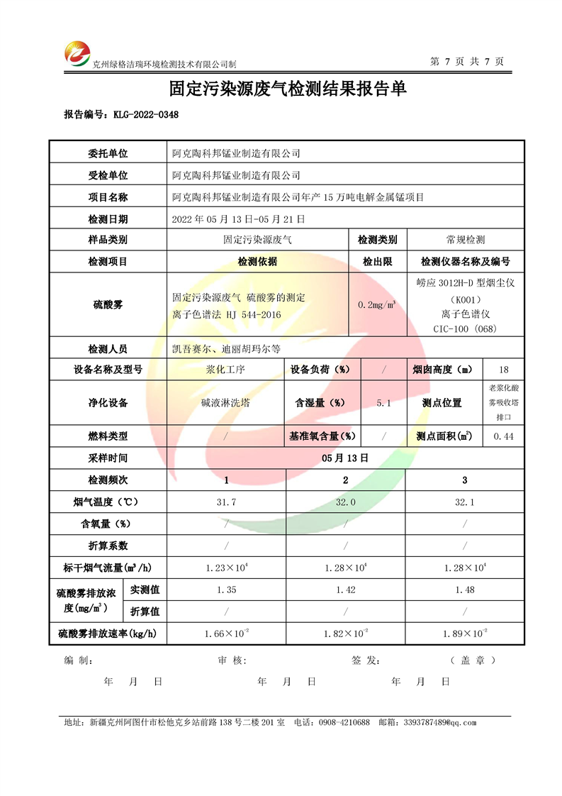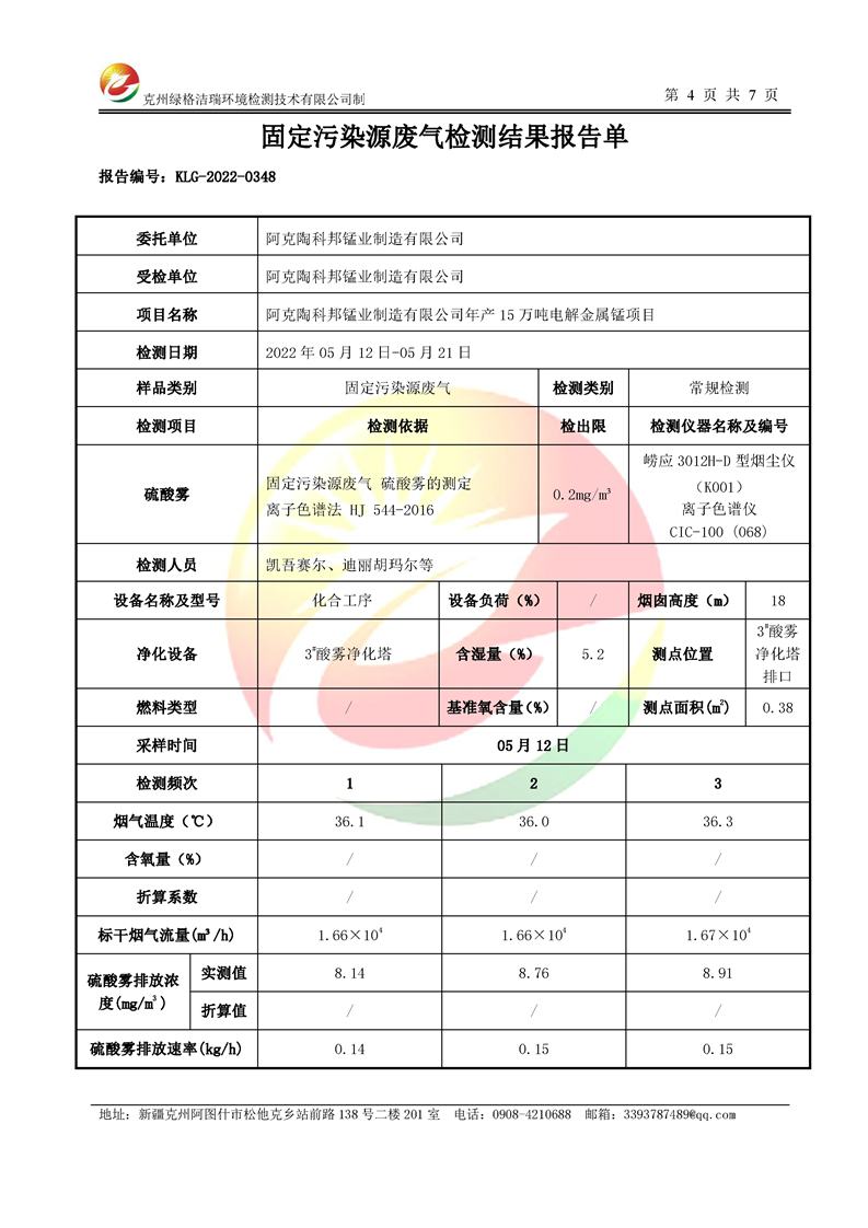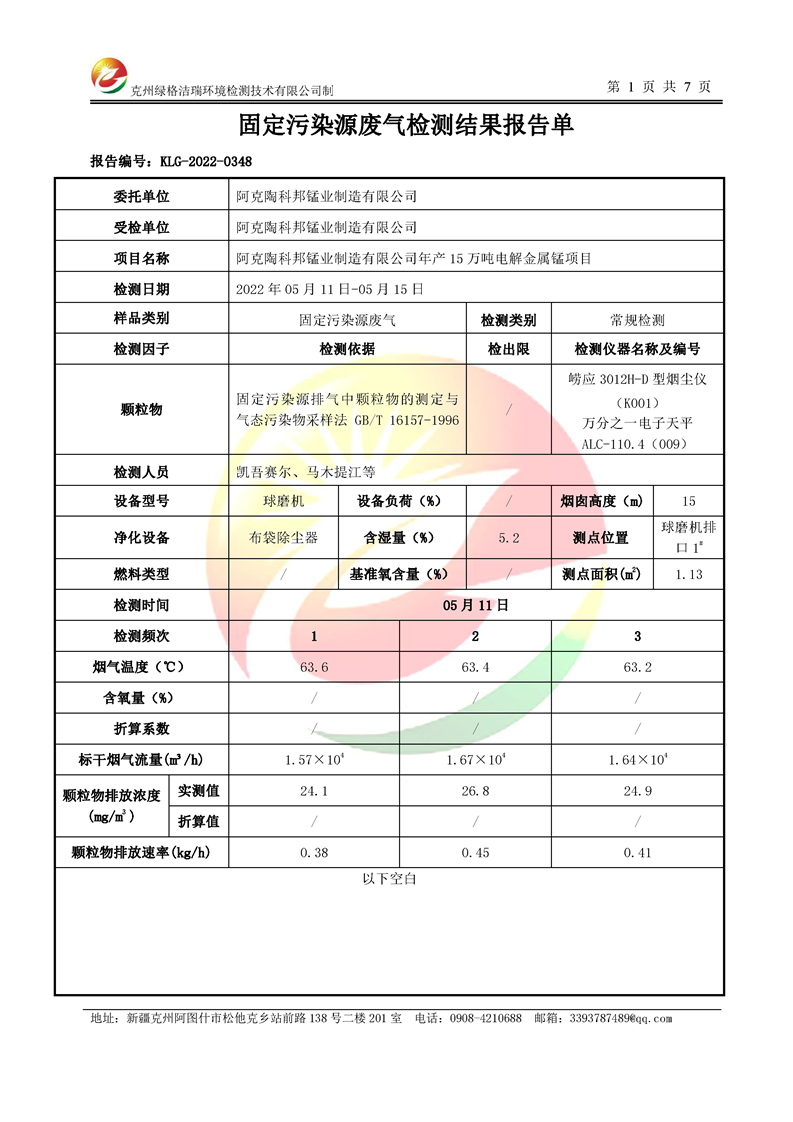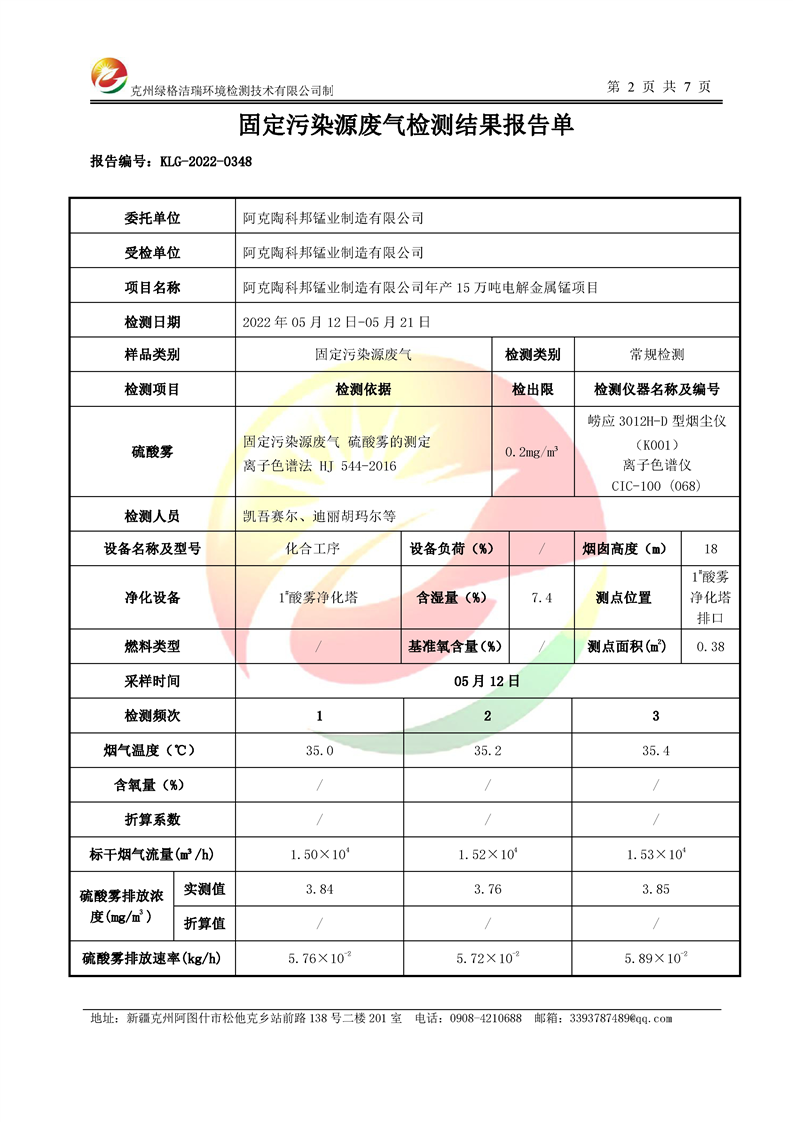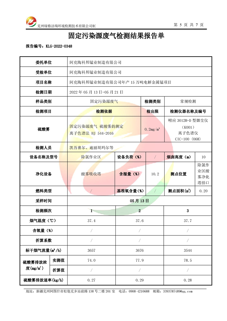 阿克陶科邦锰业制造有限公司 固定污染源5月检测报告