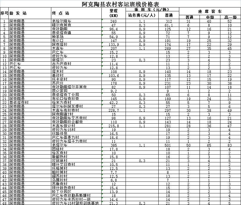 依据《中华人民共和国价格法》、《新疆维吾尔自治区定价目录》、《政府制定价格听证办法》等规定。县交通局、发改委依据《阿克陶县第十七届人民政府第三十三次常务会议纪要》(陶政阅[2022]45号)文件及《关于发布<新疆维吾尔自治区汽车运价实施细则>的通知》(新交运〔2011〕19号)文件标准,结合我县实际情况,现将我县农村客运班线座席车价格调整如下: