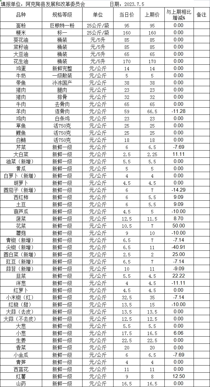 2023年7月5日阿克陶县肉、禽、蛋、菜、水产品价格监测表