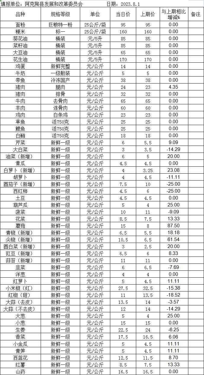2023年8月1日阿克陶县肉、禽、蛋、菜、水产品价格监测表