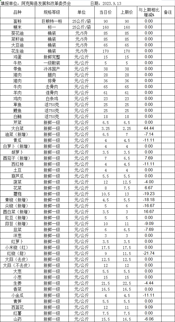2023年9月13日阿克陶县肉、禽、蛋、菜、水产品价格监测表