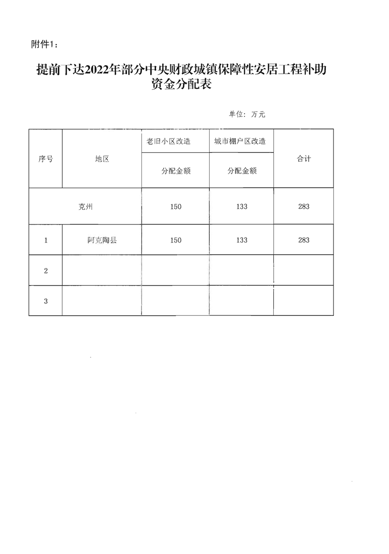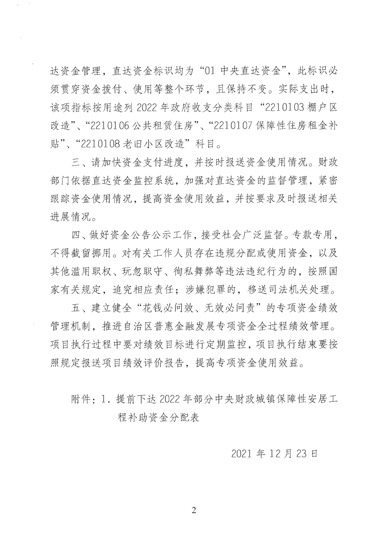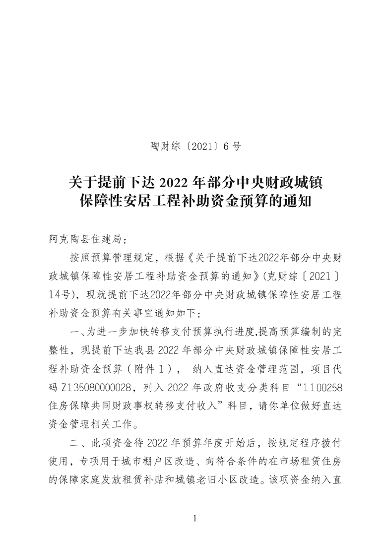 关于提前下达2022年部分中央财政城镇保障性安居工程补助资金预算的通知