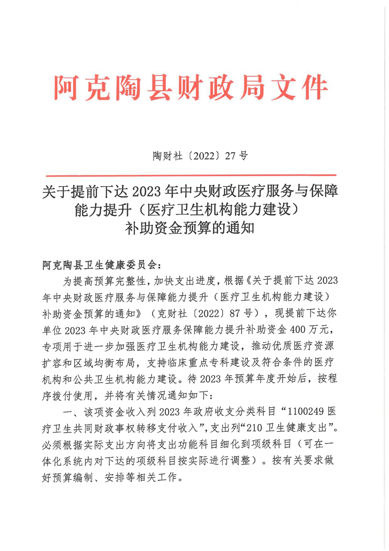 关于提前下达2023年中央财政医疗服务与保障能力提升(医疗卫生机构能力建设)补助资金预算的通知