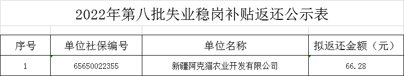 现将阿克陶县2022年第八批初审符合稳岗返还补贴政策的1家企业名单及金额面向社会公示,公示期为5个工作日(2023年1月6日-1月12日),公示期内有异议的,请及时向阿克陶县人力资源和社会保障局反映。