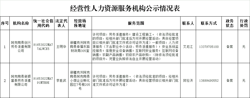 根据《关于全面推行人力资源服务许可告知承诺制和人力资源服务备案管理的通知》的要求,现将阿克陶县经营性人力资源服务机构年度报告进行公示,具体见附件。