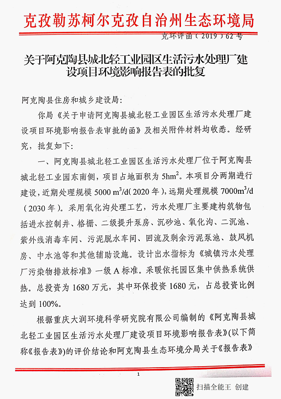 2019年11月17日取得《关于阿克陶县城北轻工业园区生活污水处理厂建设项目环境影响报告表的批复》(克环评函【2019】62号);