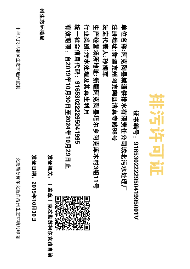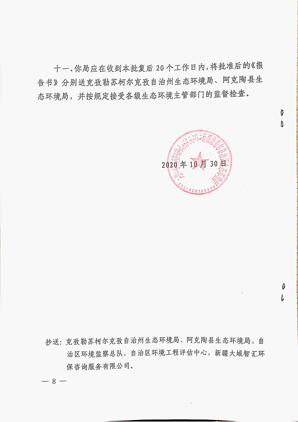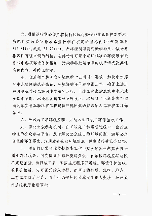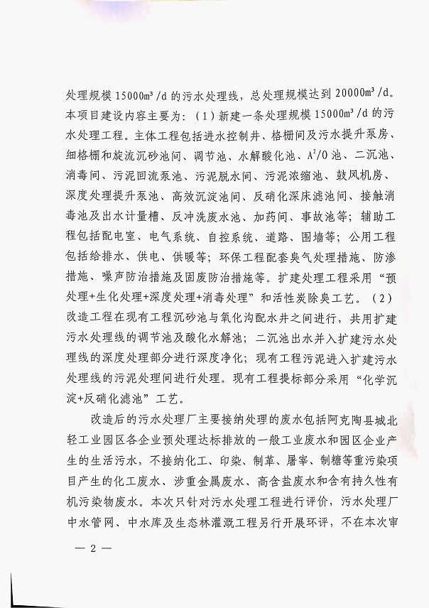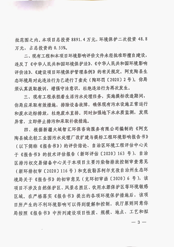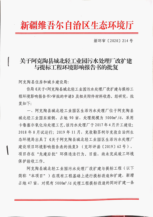 (4)新疆维吾尔自治区生态环境厅《关于<阿克陶县城北轻工业园区污水处理厂改扩建与提标工程环境影响报告书>的批复》(新环审〔2020〕214号),2020年10月30日;)