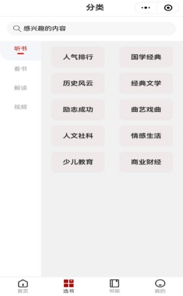 6、少儿绘本机。具有推荐图书,推荐听书,我的等推荐。热门电子图书,分类包含励志成长、文学作品、少儿故事、历史军事、人文社科、古典国学、中外名著、教材教辅、人物传记、外语阅读、哲学宗教、经济管理、法律政治、党政图书分类。1.3万辑有声图书,分类包括:外语学习、健康养生、文学名著、戏曲、儿童、历史、评书、科技、武侠小说、人物传记、有声书。
