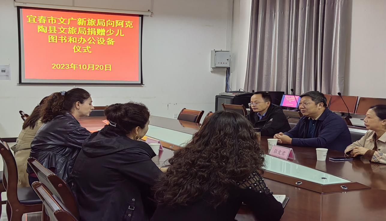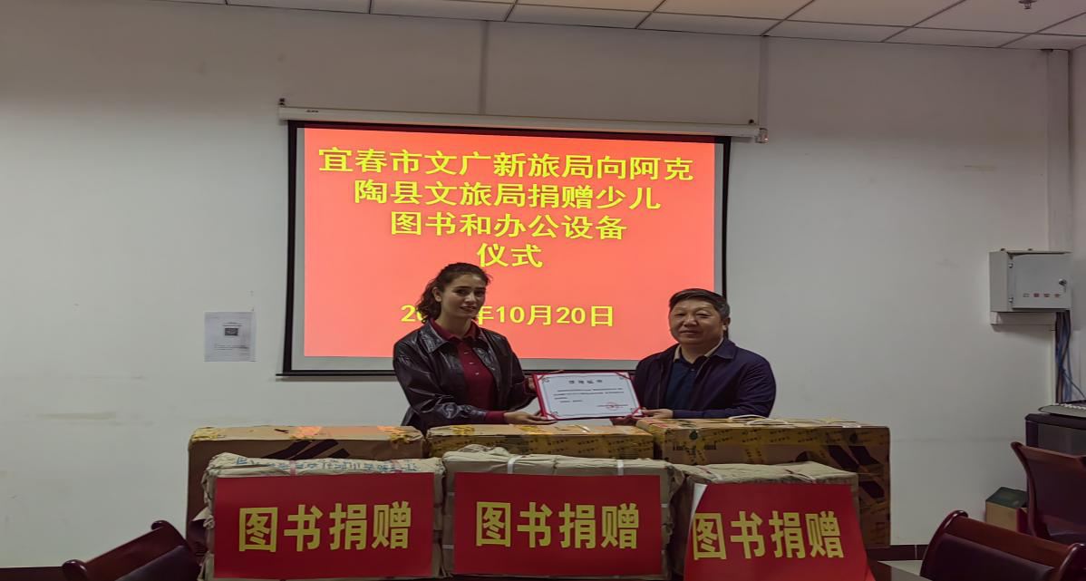 在宜春市文广新旅局援疆干部的牵线下,2023年10月20日,江西省宜春市文化广电新闻出版旅游局、新疆阿克陶县体育广播电视和旅游局图书捐赠仪式在阿克陶县图书馆举行,宜春市文广新旅局二级调研员况海水、宜春市图书馆馆长张爱君、宜春市文广新旅局援疆干部邓军与阿克陶县文旅局局长代娜古丽·库热西、阿克陶县图书馆馆长马晓红及图书馆全体干部参加活动。