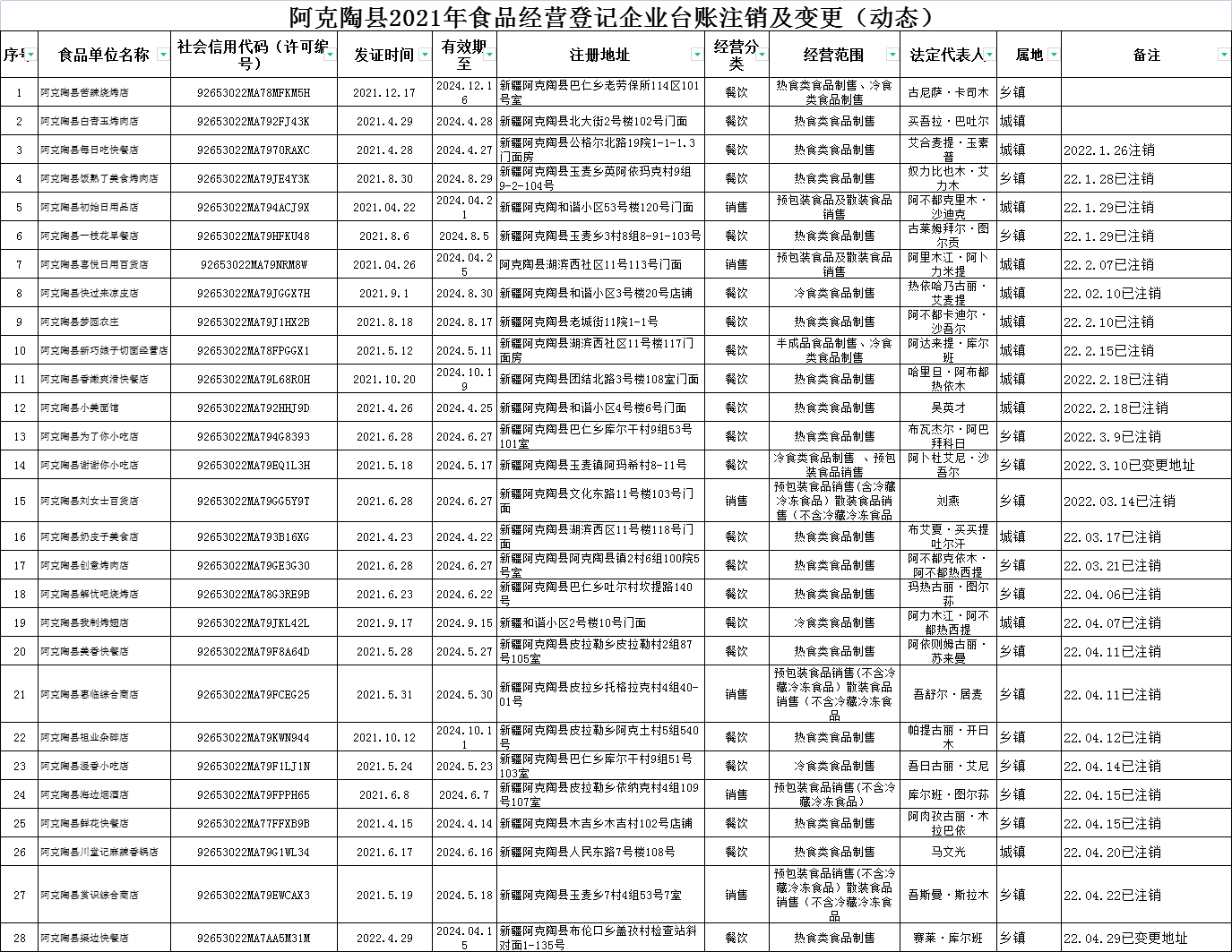 阿克陶县2021年食品经营登记企业台账注销及变更(动态)