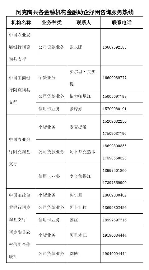 为进一步推动金融支持助企纾困相关举措的实施,统筹疫情防控和金融服务保障工作,全力帮助广大人民群众和市场主体纾困解难,阿克陶县各银行业金融机构已开通金融助企纾困服务热线,广大人民群众和各市场主体可通过热线咨询延期还本付息、优惠信贷产品、金融纾困相关政策、反映复工复产中涉及融资领域的问题诉求。