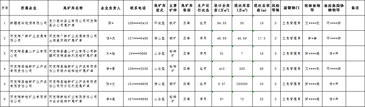 阿克陶县尾矿库安全生产包保(包联)责任公告清单