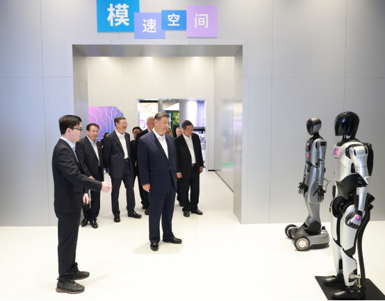 4月29日,中共中央总书记、国家主席、中央军委主席习近平在上海考察。这是习近平在位于徐汇区的上海“模速空间”大模型创新生态社区人工智能产品体验店考察。新华社记者谢环驰摄