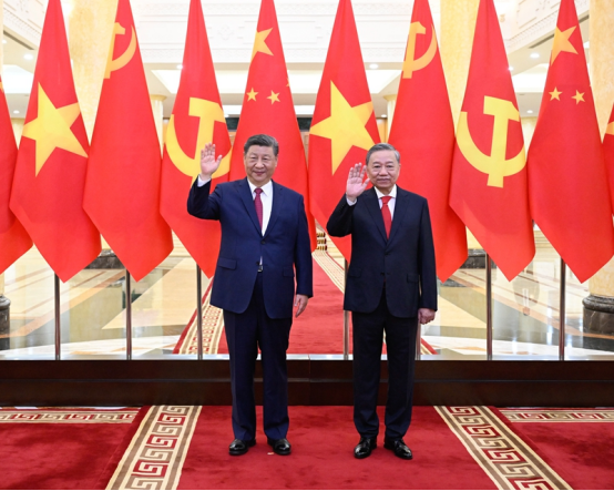 习近平强调,今年是中越建交75周年暨“中越人文交流年”。75年来,无论国际风云如何变化,双方在争取国家独立和民族解放的斗争中相互支持,在社会主义建设事业中携手并进,在推进各自现代化进程中砥砺前行,成为社会主义国家团结合作的典范。面对变乱交织的国际形势,中越两国坚持和平发展,深化友好合作,为世界带来了宝贵的稳定性和确定性。站在新的历史起点上,双方要继往开来、携手前行,赓续“越中情谊深、同志加兄弟”的传统友谊,按照政治互信更高、安全合作更实、务实合作更深、民意基础更牢、多边协调配合更紧、分歧管控解决更好的“六个更”总体目标,高质量推动全面战略合作,确保中越命运共同体建设行稳致远,为构建人类命运共同体作出新的更大贡献。
