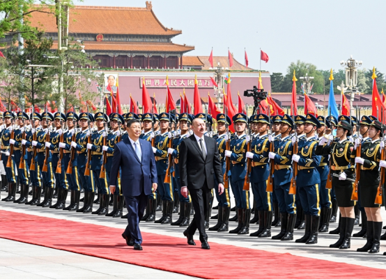 4月23日上午,国家主席习近平在北京人民大会堂同来华进行国事访问的阿塞拜疆总统阿利耶夫举行会谈。这是会谈前,习近平在人民大会堂东门外广场为阿利耶夫举行欢迎仪式。新华社记者李涛摄