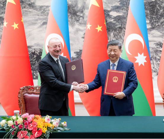4月23日上午,国家主席习近平在北京人民大会堂同来华进行国事访问的阿塞拜疆总统阿利耶夫举行会谈。会谈后,两国元首共同签署《中华人民共和国和阿塞拜疆共和国关于建立全面战略伙伴关系的联合声明》。新华社记者翟健岚摄