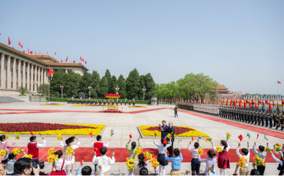 4月23日上午,国家主席习近平在北京人民大会堂同来华进行国事访问的阿塞拜疆总统阿利耶夫举行会谈。这是会谈前,习近平在人民大会堂东门外广场为阿利耶夫举行欢迎仪式。新华社记者翟健岚摄