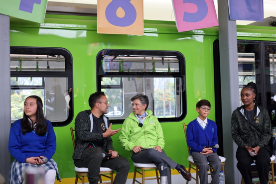 2023年8月10日,哥伦比亚波哥大市长克劳迪娅·洛佩斯(中)在波哥大地铁的模型车厢旁跟参加活动的师生交流。按照计划,由中企承建和运营的波哥大地铁一号线将在2028年正式投入运营。新华社记者周盛平摄
