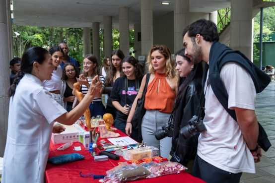 2025年4月15日,在巴西里约热内卢天主教大学举办的“国际中文日”庆祝活动上,学生们观看中医疗法展示。新华社记者王天聪摄