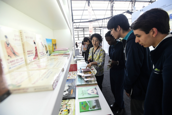 2024年11月8日,在智利圣地亚哥马波乔艺术文化中心内,当地民众在第43届智利圣地亚哥国际书展期间参观中国展区。新华社发(豪尔赫·比列加斯摄)