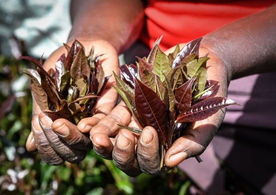 2024年5月6日,在肯尼亚穆拉雅郡的一处紫茶园,茶农展示采摘下来的紫茶。新华社记者韩旭摄