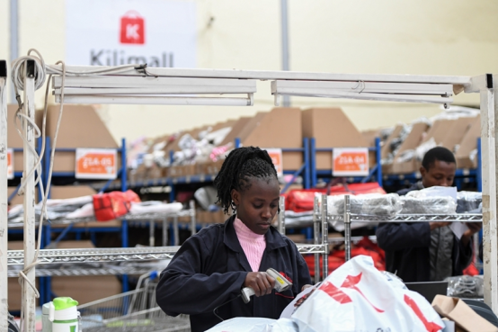 2023年4月20日,在肯尼亚姆洛隆戈,Kilimall员工在仓库内包装商品出库。新华社发(辜鹏博摄)