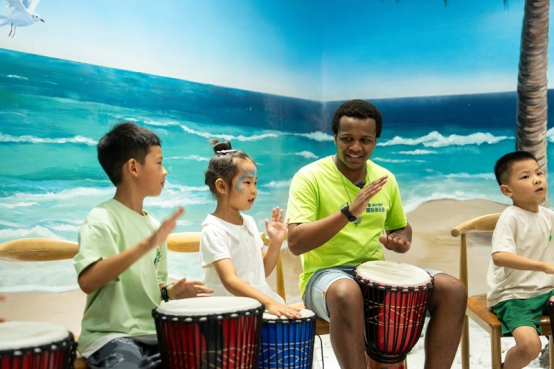 2024年8月30日,在位于湖南高桥大市场的中非经贸博览会常设展馆安哥拉馆,志愿者(右二)带领学生学习非洲鼓。新华社记者陈思汗摄