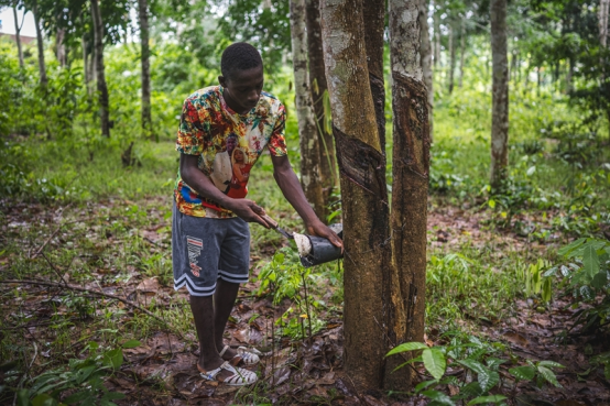 2025年5月30日,橡胶种植户在科特迪瓦圣佩德罗省大贝雷比镇收割橡胶。新华社记者王冠森摄
