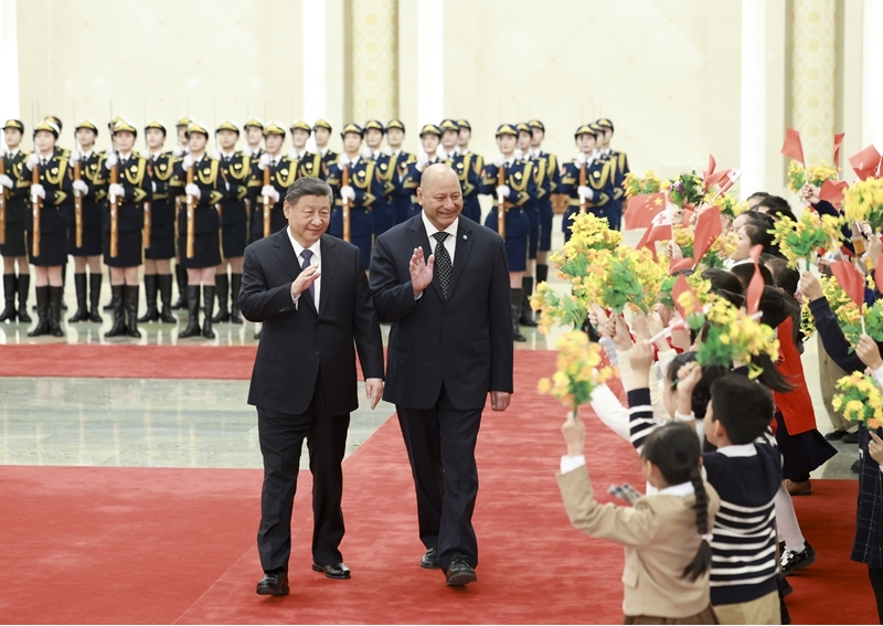 会见前,习近平和夫人彭丽媛在人民大会堂北大厅为图普六世和王后娜娜茜帕乌举行欢迎仪式。