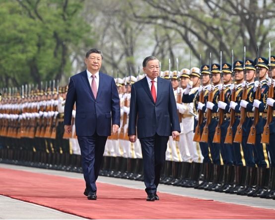 4月15日上午,中共中央总书记、国家主席习近平在北京人民大会堂同来华进行国事访问的越共中央总书记、国家主席苏林举行会谈。这是会谈前,习近平在人民大会堂东门外广场为苏林举行欢迎仪式。新华社记者燕雁摄