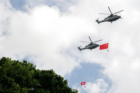 7月1日,香港特区政府在金紫荆广场举行升旗仪式,庆祝香港回归祖国28周年。这是分别悬挂中华人民共和国国旗、香港特区区旗的直升机从空中飞过。