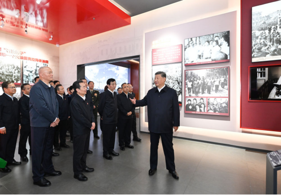 参观主题成就展时,习近平总书记在一个展现易地扶贫搬迁的新旧复原场景前驻足。