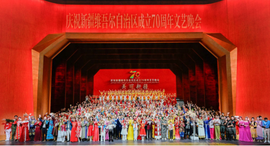 9月24日晚,庆祝新疆维吾尔自治区成立70周年文艺晚会《美丽新疆》在乌鲁木齐文化中心大剧院举行。新华社记者申宏摄