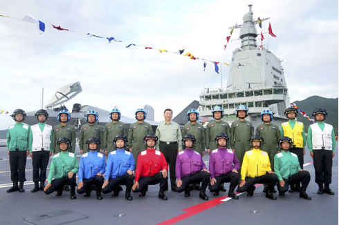 11月5日,我国第一艘电磁弹射型航空母舰福建舰入列授旗仪式在海南三亚某军港举行。中共中央总书记、国家主席、中央军委主席习近平出席入列授旗仪式并登舰视察。这是习近平同舰载机飞行员、航空保障人员合影留念。