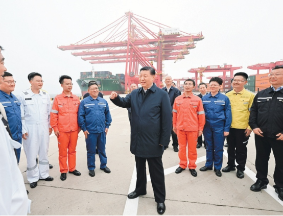 2024年5月22日至24日,中共中央总书记、国家主席、中央军委主席习近平在山东考察。这是22日下午,习近平在日照港亲切慰问港口科技工作者、运营人员、航运人员。新华社记者谢环驰/摄