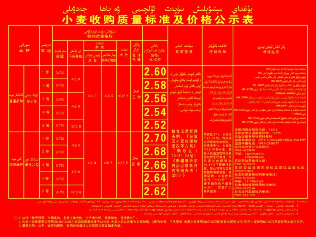 另外,我县制定优质品种(新冬22号)小麦价格为:一等小麦2.70元/公斤;二等小麦2.68元/公斤;三等小麦2.66元/公斤;四等小麦2.64元/公斤;五等小麦2.62元/公斤。收购价格在各粮站进行了公示,小麦水分低于12.5%以内的质量合格小麦,各粮站敞开收购,当场结算,不扣杂、不打白条,欢迎广大粮农监督。