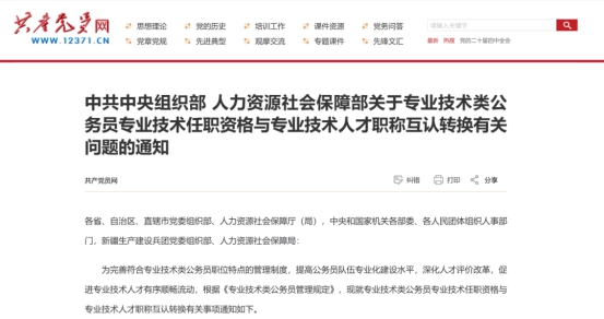 1月8日,共产党员网发布《中共中央组织部人力资源社会保障部关于专业技术类公务员专业技术任职资格与专业技术人才职称互认转换有关问题的通知》,全文如下。