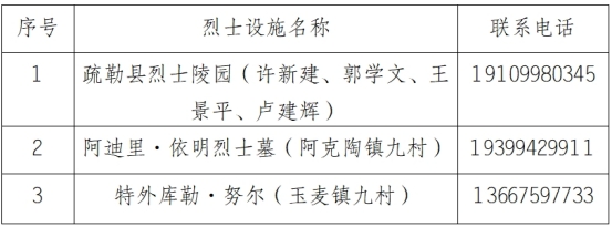 五、现场祭扫倡导预约入园。当前我县两处零散烈士墓及疏勒县烈士陵园正常对外开放,为缓解人员聚集带来的风险隐患,倡导预约登记和错峰祭扫,请您在前往烈士纪念场所前联系相关负责人登记信息,根据反馈情况合理安排行程,我们将努力做好接待工作,为您营造良好的祭扫环境。
