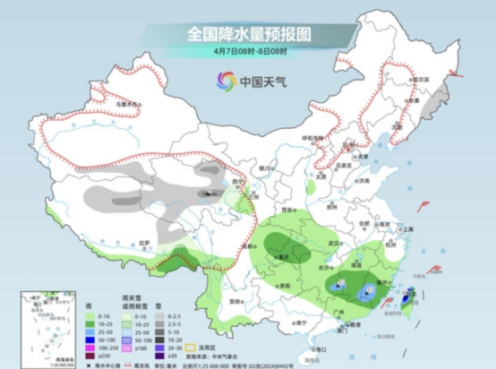4月7日8时—8日8时全国降水量预报图。来源:中国天气网