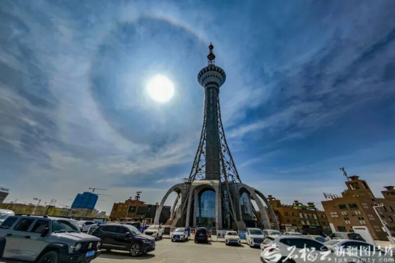 4月2日,在喀什市昆仑塔附近拍摄的日晕景观。石榴云/新疆日报记者蔡增乐摄