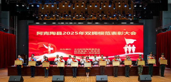 会议在庄严的国歌声中拉开帷幕。会上,宣读了《关于表彰阿克陶县2025年双拥模范集体和模范个人的决定》,对爱国拥军模范单位、爱国拥军模范个人、最美军嫂等代表进行表彰。