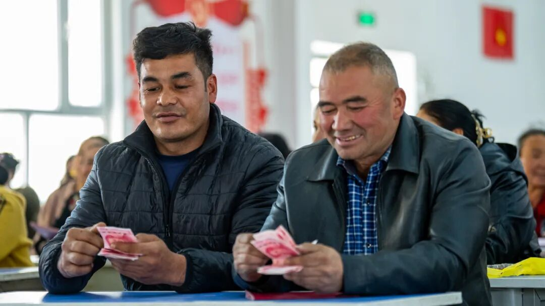 ▲图为村民们仔细清点分红,享受集体经济发展的红利。全媒体记者麦合木提·阿卜拉摄